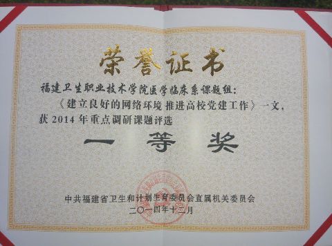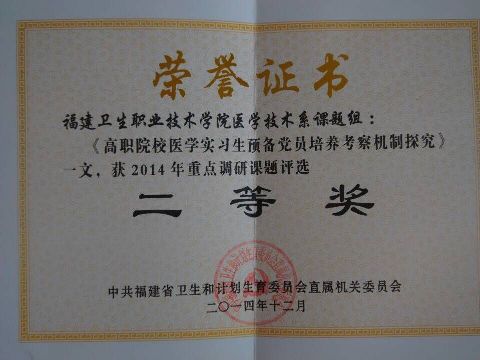 近日,福建省衛(wèi)生和計劃生育委員會直屬機關委員會下發(fā)了《關于表彰2014年重點課題調研獲獎論文的通報》(閩衛(wèi)委直黨〔2014〕39號),學院醫(yī)學基礎部臨床醫(yī)學系黨總支課題組調研成果《建立良好的網絡環(huán)境 推進高校黨建工作》和醫(yī)學技術系黨總支課題組調研成果《高職院校醫(yī)學實習生預備黨員培養(yǎng)考察機制探究》分別獲得一等獎和二等獎。(黨委工作部)