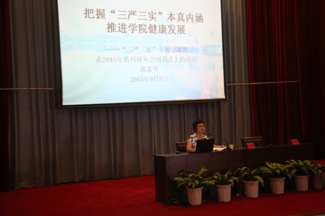 郭素華院長就“把握‘三嚴(yán)三實’本真內(nèi)涵 推進學(xué)院健康發(fā)展”給大家上了一堂主題黨課,并就學(xué)院新學(xué)期工作進行了部署。郭院長引用《左傳》、《資治通鑒》等歷史典故深入淺出地闡釋了“三嚴(yán)三實”的豐富內(nèi)涵,要求廣大黨員干部要向習(xí)近平總書記提出的新時期好干部標(biāo)準(zhǔn)看齊;郭院長指出,當(dāng)前在一些領(lǐng)導(dǎo)干部身上還不同程度存在“十個方面”和“八缺八不缺”等問題,郭院長勸勉全體黨員干部要對照問題清單,從嚴(yán)要求,時刻自重自省自警自勵。郭院長強調(diào),“三嚴(yán)三實”學(xué)習(xí)教育要與學(xué)院新學(xué)期的工作緊密結(jié)合,要全面落實《學(xué)院省級示范性高職院校建設(shè)方案》和《學(xué)院省級示范性高職院校建設(shè)任務(wù)書》確定的各項任務(wù),圍繞省級示范性高職院校項目驗收和第二輪高職院校人才培養(yǎng)工作評估,扎實推進各項建設(shè)。