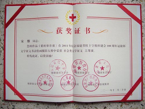 團(tuán)委宋維老師在省紅十字會(huì)、省教育廳、省文化廳、省文聯(lián)、福建日?qǐng)?bào)集團(tuán)、福建省廣播影視集團(tuán)聯(lián)合組織的“紀(jì)念福建省紅十字組織建會(huì)100周年文學(xué)征文繪畫(huà)書(shū)法攝影作品大賽”中,獲得社會(huì)類(lèi)文學(xué)征文三等獎(jiǎng)。(院團(tuán)委)