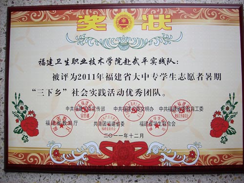 日前,我院被省委宣傳部、省文明辦、省教育工委、省教育廳、團(tuán)省委、省學(xué)聯(lián)評(píng)為2011年福建省大中專(zhuān)學(xué)生志愿者暑期“三下鄉(xiāng)”社會(huì)實(shí)踐活動(dòng)先進(jìn)單位。我院赴武平實(shí)踐隊(duì)被評(píng)為2011年福建省大中專(zhuān)學(xué)生志愿者暑期“三下鄉(xiāng)”社會(huì)實(shí)踐活動(dòng)優(yōu)秀團(tuán)隊(duì)。