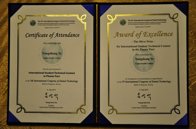 學生獲第五屆國際口腔技師學術(shù)大會(韓國)口腔醫(yī)學技術(shù)專業(yè)石膏牙雕刻銀獎