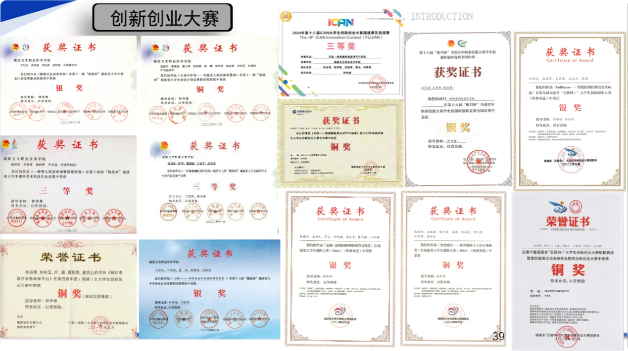 學(xué)生獲得全國醫(yī)用電子儀器技術(shù)職業(yè)技能大賽個(gè)人二等獎(jiǎng)1項(xiàng)、個(gè)人三等獎(jiǎng)1項(xiàng)、團(tuán)體三等獎(jiǎng)2項(xiàng),2022-2023“一帶一路”暨金磚國家技能發(fā)展與技術(shù)創(chuàng)新大賽一等獎(jiǎng)和最佳組織獎(jiǎng)1項(xiàng),第十八屆“振興杯”全國青年職業(yè)技能大賽學(xué)生組創(chuàng)新創(chuàng)效競賽全國決賽銅獎(jiǎng)1項(xiàng),福建省職業(yè)院校技能大賽集成電路開發(fā)及應(yīng)用賽項(xiàng)二等獎(jiǎng)3項(xiàng)、三等獎(jiǎng)1項(xiàng),福建省職業(yè)院校技能大賽物聯(lián)網(wǎng)技術(shù)應(yīng)用賽項(xiàng)三等獎(jiǎng)2項(xiàng)、福建省職業(yè)院校技能大賽智能電子產(chǎn)品設(shè)計(jì)與開發(fā)賽項(xiàng)二等獎(jiǎng)1項(xiàng)、福建省第二屆國銳杯增材制造技術(shù)綜合應(yīng)用技能大賽三等獎(jiǎng)1項(xiàng),“挑戰(zhàn)杯”福建省大學(xué)生課外學(xué)術(shù)作品競賽三等獎(jiǎng)2項(xiàng),“挑戰(zhàn)杯”福建省大學(xué)生創(chuàng)業(yè)計(jì)劃競賽銀獎(jiǎng)2項(xiàng)、銅獎(jiǎng)1項(xiàng),福建省“互聯(lián)網(wǎng)+”大學(xué)生創(chuàng)新創(chuàng)業(yè)大賽銀獎(jiǎng)1項(xiàng)、銅獎(jiǎng)1項(xiàng),中國(福建)女大學(xué)生創(chuàng)新創(chuàng)業(yè)大賽銅獎(jiǎng)1項(xiàng)、福建省大學(xué)城創(chuàng)新大賽(2024)銀獎(jiǎng)1項(xiàng)、銅獎(jiǎng)1項(xiàng),2022一帶一路暨金磚國家技能發(fā)展與技術(shù)創(chuàng)新大賽浙區(qū)域賽二等獎(jiǎng)、海峽兩岸大學(xué)生職業(yè)技能大賽物聯(lián)網(wǎng)技術(shù)應(yīng)用賽項(xiàng)三等獎(jiǎng)2項(xiàng)、智能硬件開發(fā)與應(yīng)用一等獎(jiǎng)1項(xiàng)、二等獎(jiǎng)1項(xiàng)。碼蹄杯全國大學(xué)生程序設(shè)計(jì)大賽職業(yè)院校賽道省賽金獎(jiǎng)1項(xiàng)、銅獎(jiǎng)4項(xiàng)、第十五屆藍(lán)橋杯全國軟件和信息技術(shù)專業(yè)人才大賽福建賽區(qū)Python程序設(shè)計(jì)三等獎(jiǎng)2項(xiàng)、物聯(lián)網(wǎng)設(shè)計(jì)與開發(fā)大學(xué)組三等獎(jiǎng)1項(xiàng)、單片機(jī)設(shè)計(jì)與開發(fā)職業(yè)院校組三等獎(jiǎng)1項(xiàng)。學(xué)生參與教師科研,獲國家專利2項(xiàng),國家計(jì)算機(jī)軟件著作權(quán)證書4項(xiàng)。