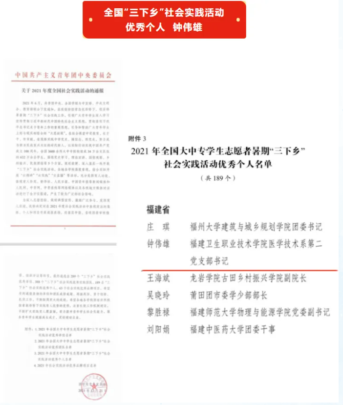 專業(yè)教師2021年研發(fā)“一種便攜式超聲診斷儀”申報(bào)國家發(fā)明專利(專利號(hào):202010734371.8),組建“醫(yī)+紅夢隊(duì)”學(xué)生團(tuán)隊(duì),參加2021年暑期“三下鄉(xiāng)”社會(huì)實(shí)踐活動(dòng),深入福建三明尤溪,為村民帶去義診關(guān)愛。