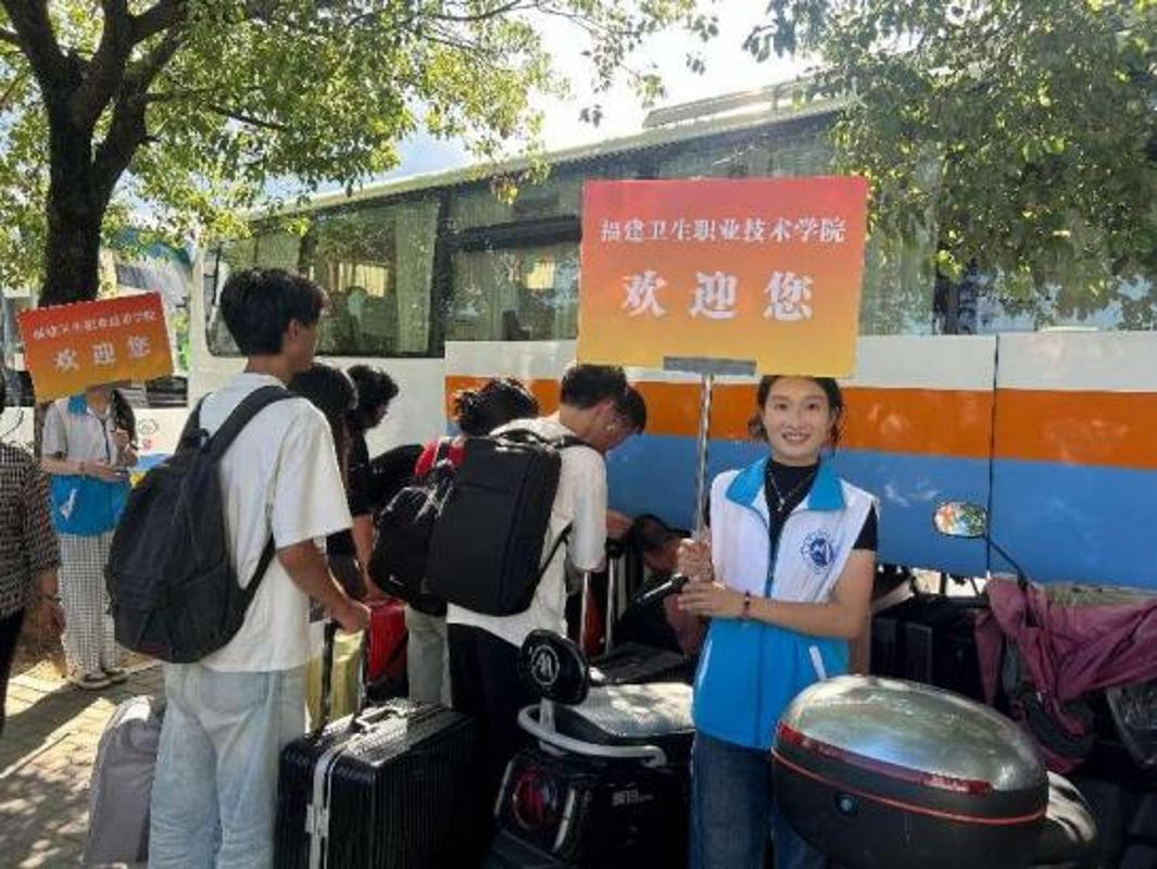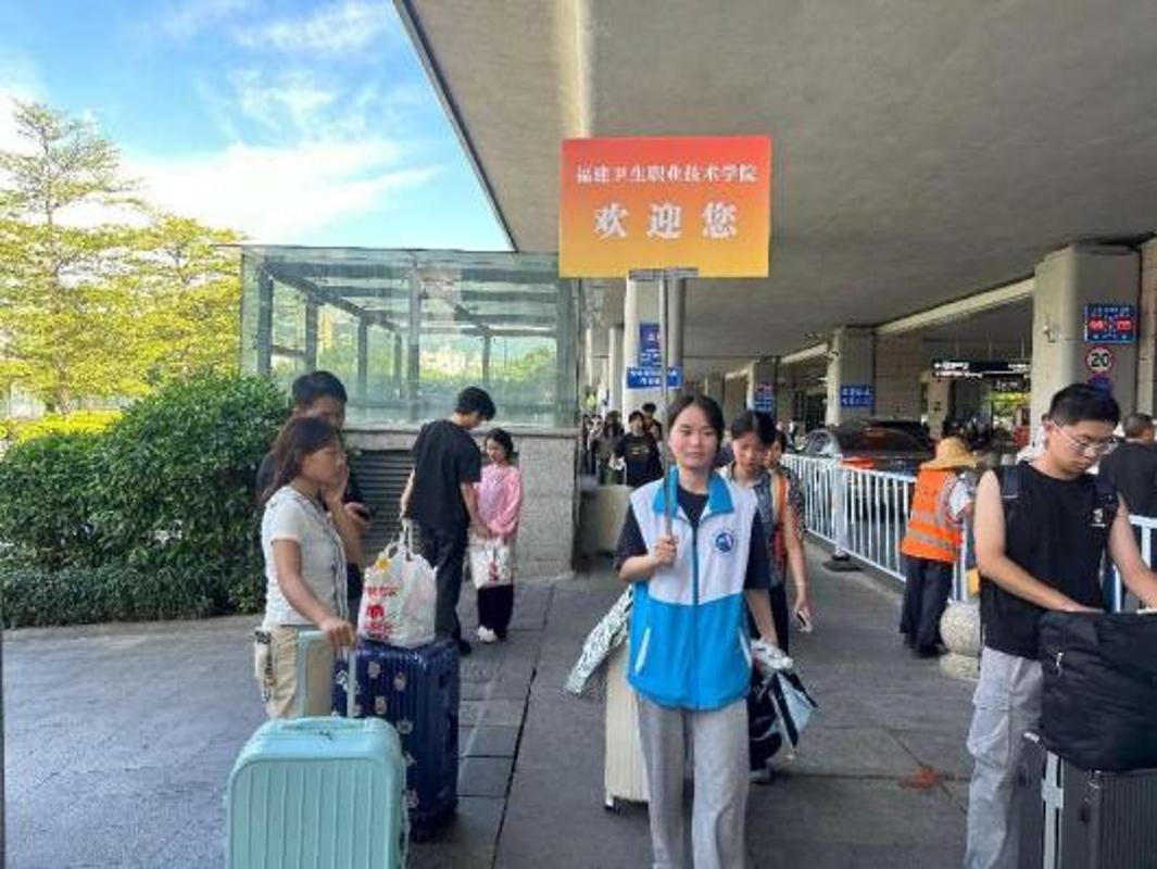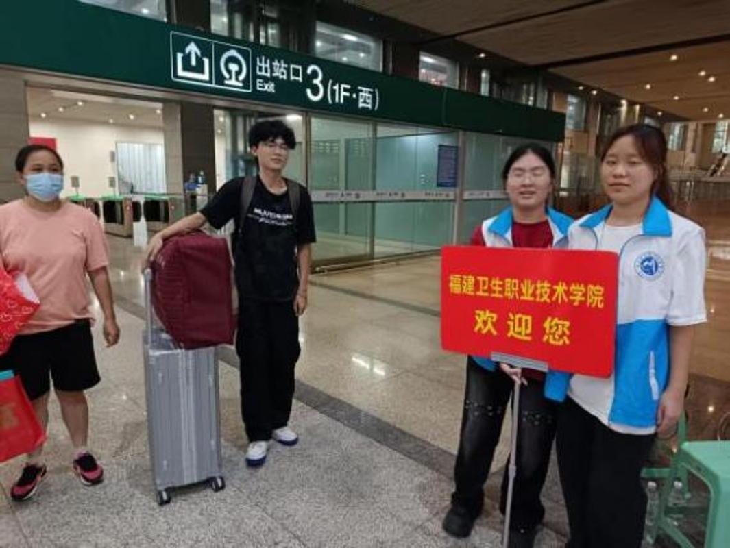 為方便新生到校,學(xué)校在福州火車站、福州南站設(shè)立了接站點,身著藍(lán)色馬甲的志愿者舉著醒目的校牌,熱情地引導(dǎo)新生乘車。