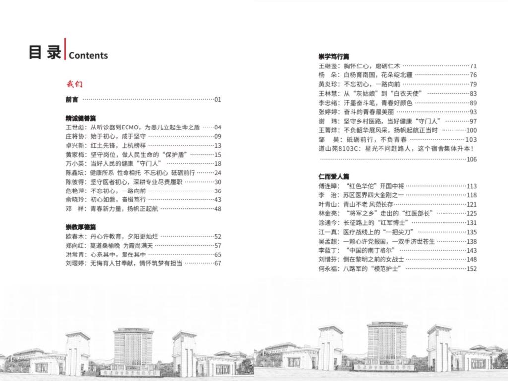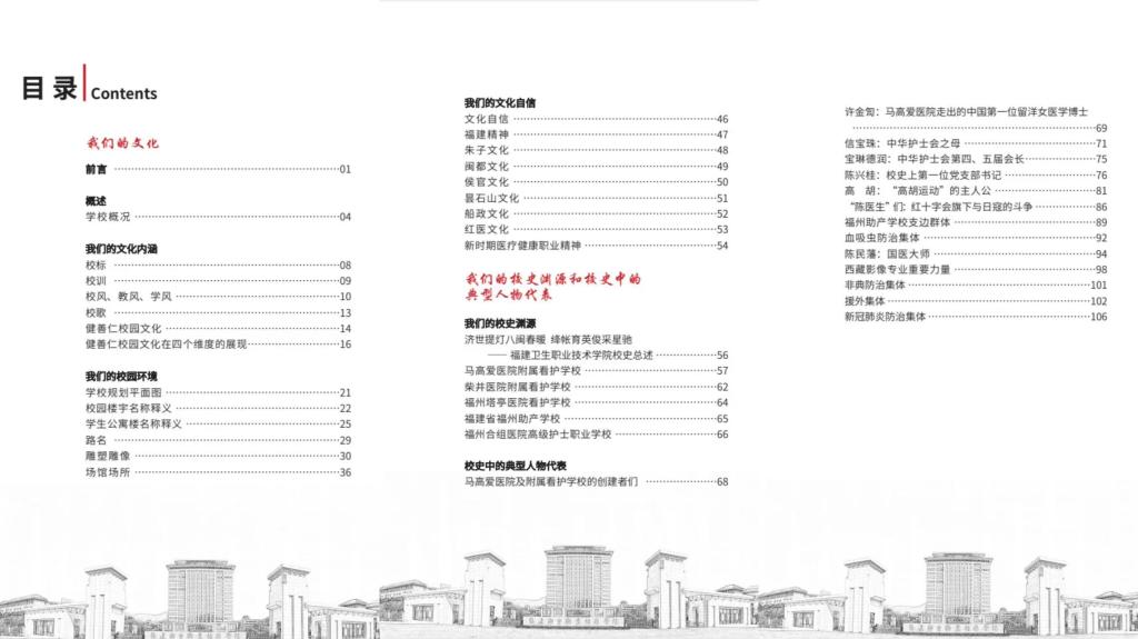 讀本以健善仁校園文化為主軸線,以校史為基,以一訓(xùn)三風(fēng)和校歌為四梁八柱,以優(yōu)秀校友、優(yōu)秀師生事跡為磚木瓦石,以仁人志士的紅醫(yī)精神為示燈標(biāo)高,希望建造一座具有百年閩衛(wèi)特色的文化大廈。