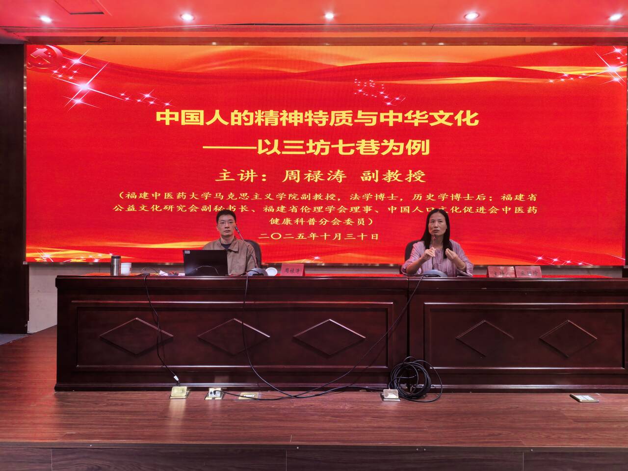 習(xí)近平總書(shū)記多次強(qiáng)調(diào),“文化自信是一個(gè)國(guó)家、一個(gè)民族發(fā)展中最基本、最深沉、最持久的力量。”為深入學(xué)習(xí)貫徹黨的二十屆四中全會(huì)精神,深入踐行習(xí)近平文化思想,探尋文化自信的源頭活水,凝聚強(qiáng)大精神力量,10月30日,我校邀請(qǐng)福建中醫(yī)藥大學(xué)馬克思主義學(xué)院副教授周祿濤作題為《中國(guó)人的精神特質(zhì)與中華文化——以三坊七巷為例》的專(zhuān)題講座。講座由馬克思主義學(xué)院副院長(zhǎng)來(lái)朋珍主持,馬克思主義學(xué)院全體專(zhuān)兼課教師、學(xué)生代表參加。