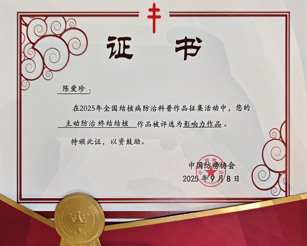 近日,中國防癆協(xié)會(huì)公布了《關(guān)于發(fā)布2025年全國結(jié)核病防治科普作品征集活動(dòng)結(jié)果和宣傳推廣的通報(bào)》,公共衛(wèi)生與健康管理學(xué)院陳愛珍老師創(chuàng)作的科普作品《主動(dòng)防治 終結(jié)結(jié)核》,從全國1931件參賽作品中脫穎而出,榮獲最佳科普作品中的“影響力作品”。