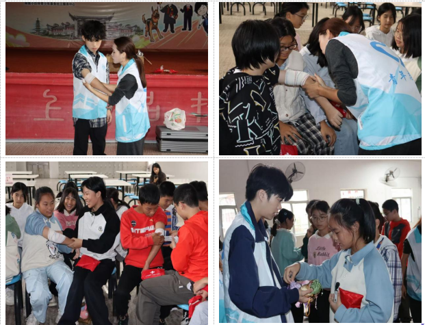 藥學(xué)院紅十字會(huì)的志愿者指導(dǎo)初中同學(xué)們急救包扎手法,將理論知識(shí)轉(zhuǎn)化為實(shí)際操作能力,在沉浸式體驗(yàn)中學(xué)習(xí)生命健康教育。