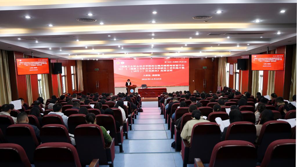 大會(huì)聽(tīng)取人事處處長(zhǎng)陳筱瑜就《福建衛(wèi)生職業(yè)技術(shù)學(xué)院崗位聘用聘期考核暫行辦法》和《〈福建衛(wèi)生職業(yè)技術(shù)學(xué)院績(jī)效工資實(shí)施方案(試行)〉補(bǔ)充規(guī)定》兩份文件所作的起草說(shuō)明。