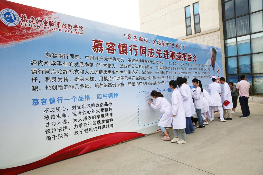 本次活動是福建衛(wèi)生職業(yè)技術(shù)學(xué)院“不忘初心、牢記使命”主題教育開展以來舉行的特色活動之一。學(xué)校黨委書記曾武祈說,希望力弘揚(yáng)學(xué)習(xí)慕容慎行同志“一個(gè)品格、四種精神”,廣大黨員干部要像慕容慎行同志那樣堅(jiān)定共產(chǎn)黨人的理想信念,牢記為人民服務(wù)的宗旨義務(wù),在各自的崗位上,對標(biāo)慕容慎行同志的先進(jìn)事跡,按照“守初心、擔(dān)使命、找差距、抓落實(shí)”的總要求,在真抓實(shí)干中踐行初心使命,為培養(yǎng)高素質(zhì)技能型衛(wèi)生健康人才作出新的貢獻(xiàn),為學(xué)院建設(shè)譜寫新的篇章。