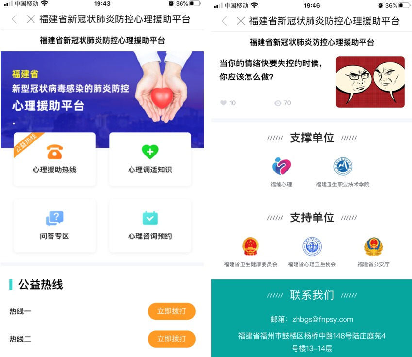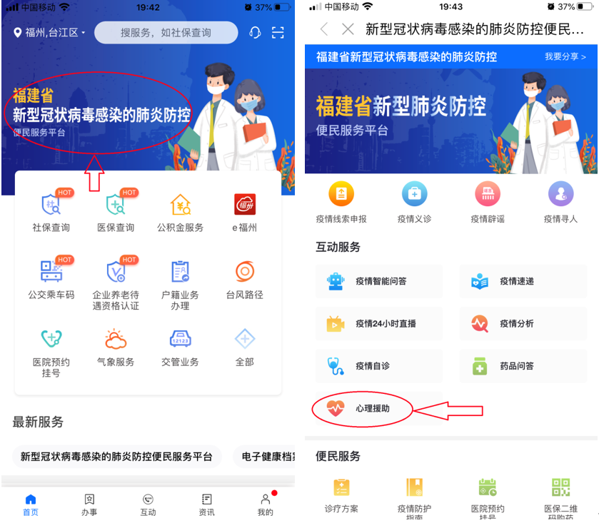 公眾可下載閩政通APP,點(diǎn)擊頭部“福建省新型冠狀病毒感染的肺炎防控”,進(jìn)入專題,點(diǎn)擊互動(dòng)服務(wù)欄目中的“心理援助”,就可進(jìn)入心理援助平臺(tái),進(jìn)行電話咨詢或網(wǎng)絡(luò)咨詢,工作時(shí)間均為每天9:00~22:00。