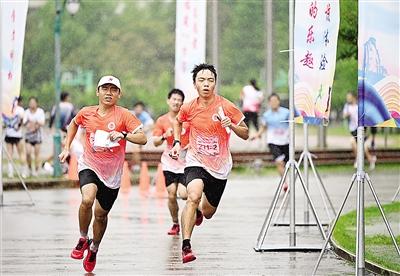 選手們冒著大雨向終點(diǎn)沖刺。 (張行健 攝)