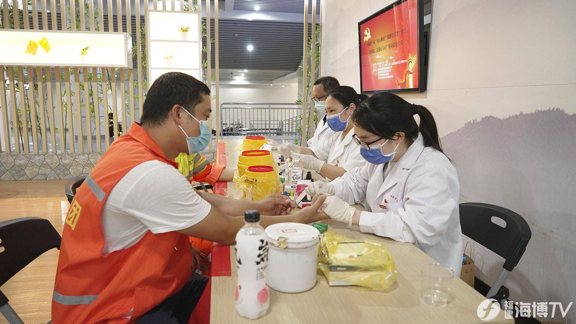 活動當(dāng)天,正值火車站區(qū)域薪火黨建聯(lián)盟單位成員之一,福建衛(wèi)生職業(yè)技術(shù)學(xué)院醫(yī)學(xué)技術(shù)系提供輪值服務(wù),師生們現(xiàn)場為參與活動的戶外工作者提供血型、血糖、乙肝抗體檢測等免費(fèi)義診的服務(wù)。
