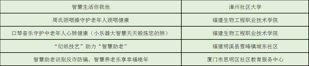 “智慧助老”優(yōu)質(zhì)教育培訓(xùn)項(xiàng)目中,漳州社區(qū)大學(xué)的《智慧生活你我他》等5個(gè)項(xiàng)目入選。