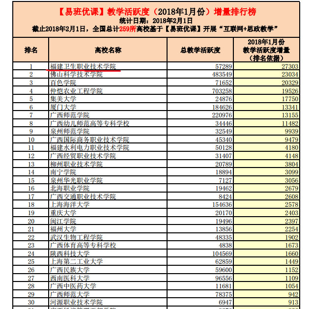 臨近春節(jié),福建衛(wèi)生職業(yè)技術(shù)學(xué)院易班網(wǎng)絡(luò)思政教育再傳喜訊,在2018年1月份全國易班優(yōu)課平臺教學(xué)活躍度增量排行榜中,該校在全國259所高校共同參與的排名中位列第一。