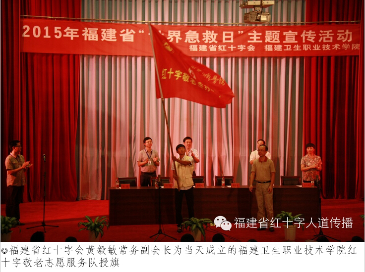 9月12日是第16個(gè)“世界急救日”,今年的主題是“急救與老齡化人群”。上午,由福建省紅十字會主辦、福建衛(wèi)生職業(yè)技術(shù)學(xué)院紅十字會承辦的“2015年‘世界急救日’系列活動啟動暨福建衛(wèi)生職業(yè)技術(shù)學(xué)院紅十字敬老志愿服務(wù)隊(duì)成立儀式”在福建衛(wèi)生職業(yè)技術(shù)學(xué)院學(xué)術(shù)廳舉行,福建省紅十字會黨組書記、常務(wù)副會長黃毅敏,省紅十字會副秘書長蔡康政,福建衛(wèi)生職業(yè)技術(shù)學(xué)院黨委書記、紅十字會會長林春明,衛(wèi)生職業(yè)技術(shù)學(xué)院紅十字會秘書長宋維出席活動儀式。