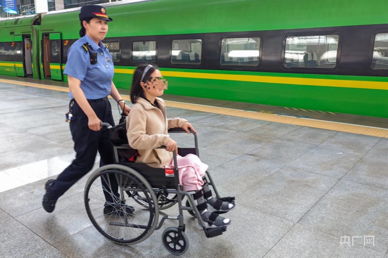 趙靜在站臺服務(wù)重點旅客(央廣網(wǎng)發(fā) 江曲 攝)