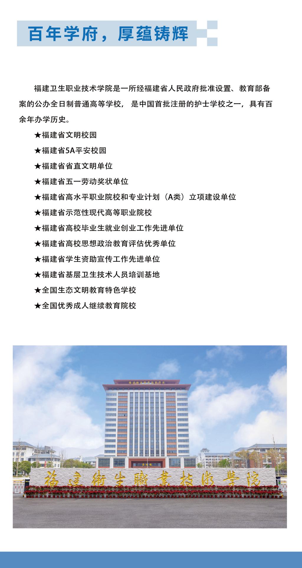 福建衛(wèi)生職業(yè)技術(shù)學院版權(quán)所有學院地址:福州市閩侯荊溪關(guān)口366號(郵編:350101)聯(lián)系電話:黨政辦公室 0591-22869917 招生就業(yè)辦公室 0591-22869955繼續(xù)教育學院 0591-22869959 閩ICP備05007543號 閩公網(wǎng)安備 35012102000005號