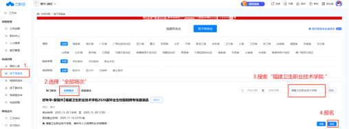 2.未注冊(cè)平臺(tái)的單位點(diǎn)擊報(bào)名鏈接,“單位登錄/注冊(cè)”進(jìn)行注冊(cè),填寫并上傳注冊(cè)資料,企業(yè)認(rèn)證審核通過(guò)后在“校園招聘-線下雙選會(huì)”全部場(chǎng)次中搜索“福建衛(wèi)生職業(yè)技術(shù)學(xué)院2026屆畢業(yè)生校園招聘專場(chǎng)”(如下圖)