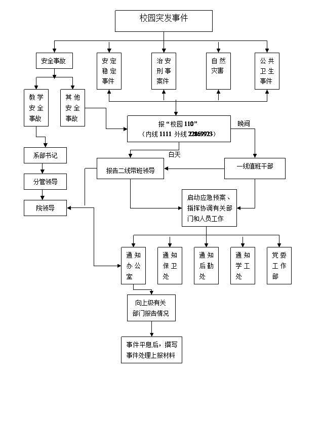 (3)根據(jù)現(xiàn)場情況,一線值班人員,應(yīng)及時(shí)了解情況控制事態(tài),視情節(jié)輕重通知相關(guān)處室、系部等人員,有關(guān)人員接到通知應(yīng)立即趕到現(xiàn)場處理事件。