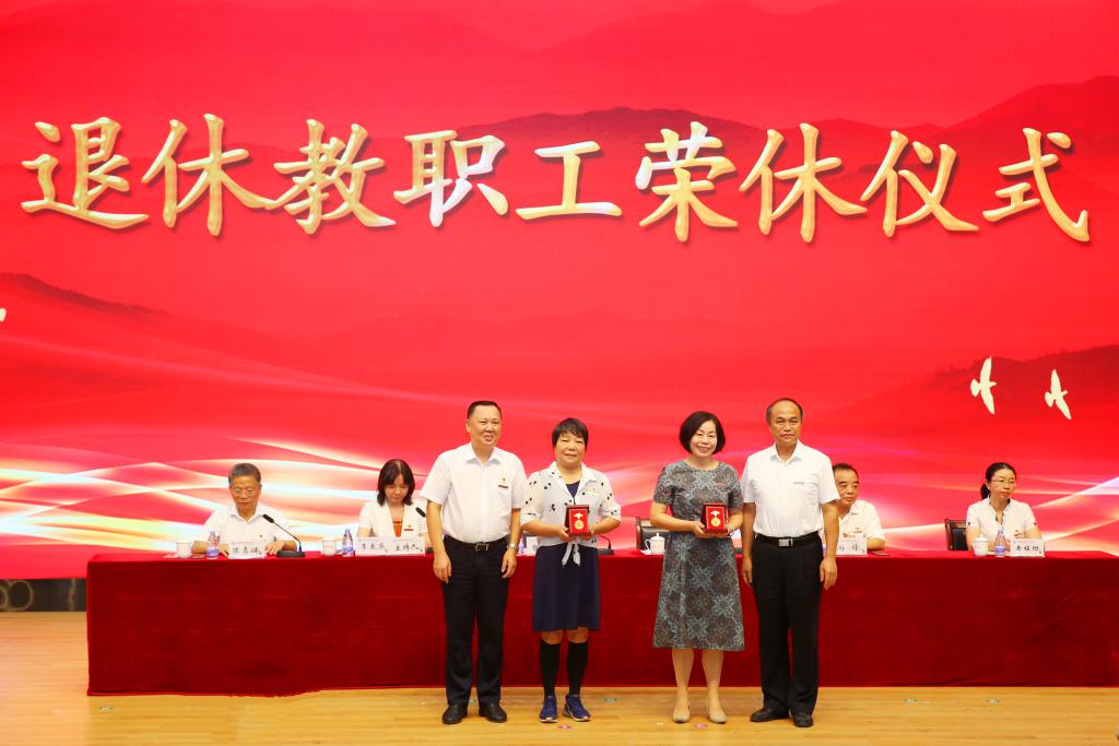 隨后進行了教職工榮休儀式,曾武祈、許能鋒為退休教職工代表鄭韻芳、蔡丹鳳2位老師頒發(fā)了“光榮退休紀念章”,代表學校向她們及全體離退休教職工致以衷心感謝和崇高敬意。