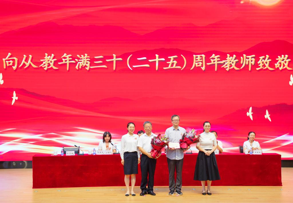 曾武祈和許能鋒還為獲得從教滿三十年周年的教師代表陳貞健、廖偉堅2位老師頒發(fā)證書,以掌聲和鮮花向所有在教育事業(yè)默默躬耕、無私奉獻的教師致敬。