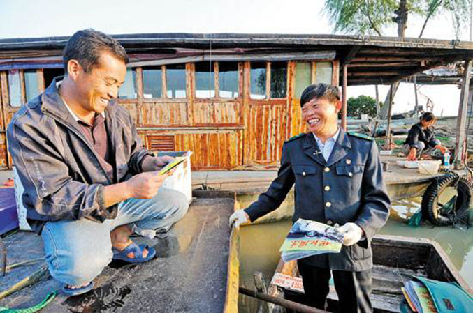 每次去投遞,唐真亞總會記錄下漁民們需要的生活用品,并買來給他們送到家門口。除了信件、報(bào)刊等,他船上往往還捎著給漁民們帶的東西:日用品、浮球、煤氣、米面……十分豐富。時(shí)間久了,漁民們就把存取錢、交話費(fèi)的事也交給了他。唐真亞既當(dāng)郵遞員,又當(dāng)采購員、送貨員。為了抓緊時(shí)間投遞,給漁民朋友送東西,每次出門,他會給自己帶上些烙餅等食物。他的午飯和晚飯,經(jīng)??窟@些在船上解決。“幫助別人讓我感覺心中很滿”。唐真亞說。