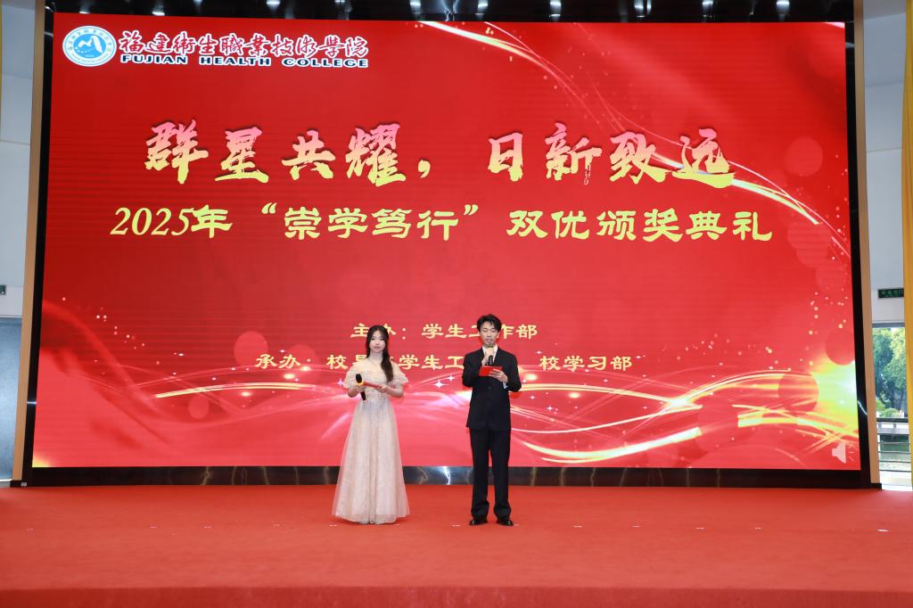 5月13日晚,暮色輕垂,學校崇學廳內(nèi)燈火如晝,暖光流轉(zhuǎn)。校領(lǐng)導、相關(guān)職能部門負責人、二級學院黨委書記、輔導員及學生代表們踏著仁心湖畔棧道走來,衣袂間流轉(zhuǎn)著初夏的晚風。當主持人清越的嗓音劃破暮色,2025年“崇學篤行”雙優(yōu)頒獎典禮這場湖畔之約便在波光與星光的見證下,徐徐展開華章。