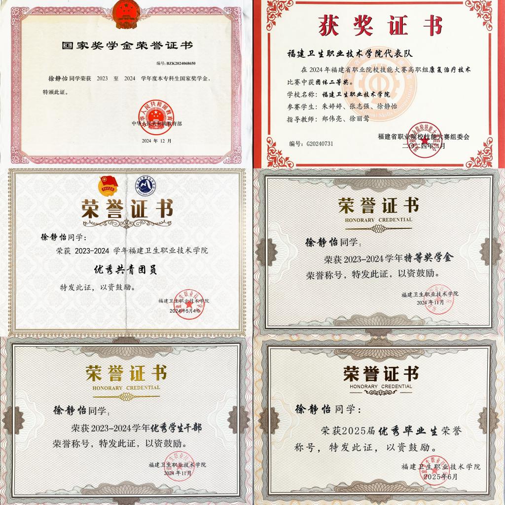 憑借不懈努力,徐靜怡在校期間榮獲2023-2024學(xué)年國(guó)家獎(jiǎng)學(xué)金、校特等獎(jiǎng)學(xué)金,并先后獲得“優(yōu)秀班干部”“優(yōu)秀共青團(tuán)員”等榮譽(yù)稱號(hào)。