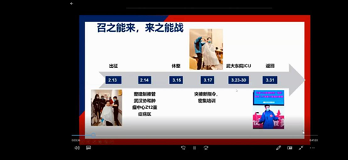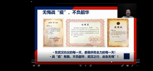 接著,危艷萍向大家生動細致的分享自己的“從戰(zhàn)”經(jīng)歷,2020年2月12日遞交請戰(zhàn)書,2月13日晚接到第二天就要出發(fā)武漢的通知,疫情就是命令,防控就是責任,她和眾多醫(yī)護工作者一樣,毫不猶豫的踏上奔赴武漢的戰(zhàn)場。剛到武漢時,防護物資還很緊張,沒有靴套就用醫(yī)療垃圾袋,外科手套不足就用檢查手套,到后來防護物資才逐漸充裕。令危艷萍最難忘的還是穿著防護服每天工作7、8個小時,衣服干了又濕,濕了又干。防護口罩勒的耳朵感覺快要掉了,護目鏡壓得鼻梁、顴骨持續(xù)疼痛,厚厚的防護服悶得她喘不上氣。那些平時簡單輕松就能完成的工作變得困難重重,干什么都有費力感。人也容易疲勞,有一次蹲下休息,差點站不起來,但忙起來所有的不適也就忘了。