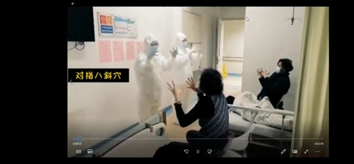 課程一開始,危艷萍為大家播放一段視頻“一、二、三,吸氣……”“記住,有個要點,吸三秒,呼六秒……”,視頻中是危艷萍在指導(dǎo)新冠肺炎病人做呼吸操。教病人做呼吸操,并不在援鄂醫(yī)療隊對新冠肺炎病人的護理職責范圍之內(nèi),但是作為一名專業(yè)護士,一位熱愛護理事業(yè)的白衣天使,危艷萍覺得,只要對患者康復(fù)有益,做什么都可以,教病人做呼吸操,在防護服背后寫心靈雞湯,使用精油為病人安眠,組員為病人手繪64幅加油小插畫,這些精神上的慰藉有效的拉近了醫(yī)護人員與病人之間的距離,只為讓病人心情愉快,更快的戰(zhàn)勝病魔。