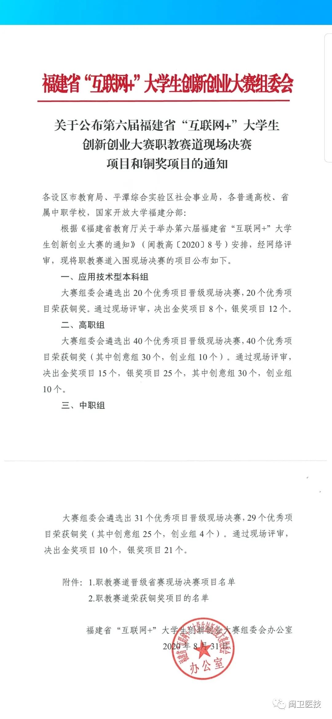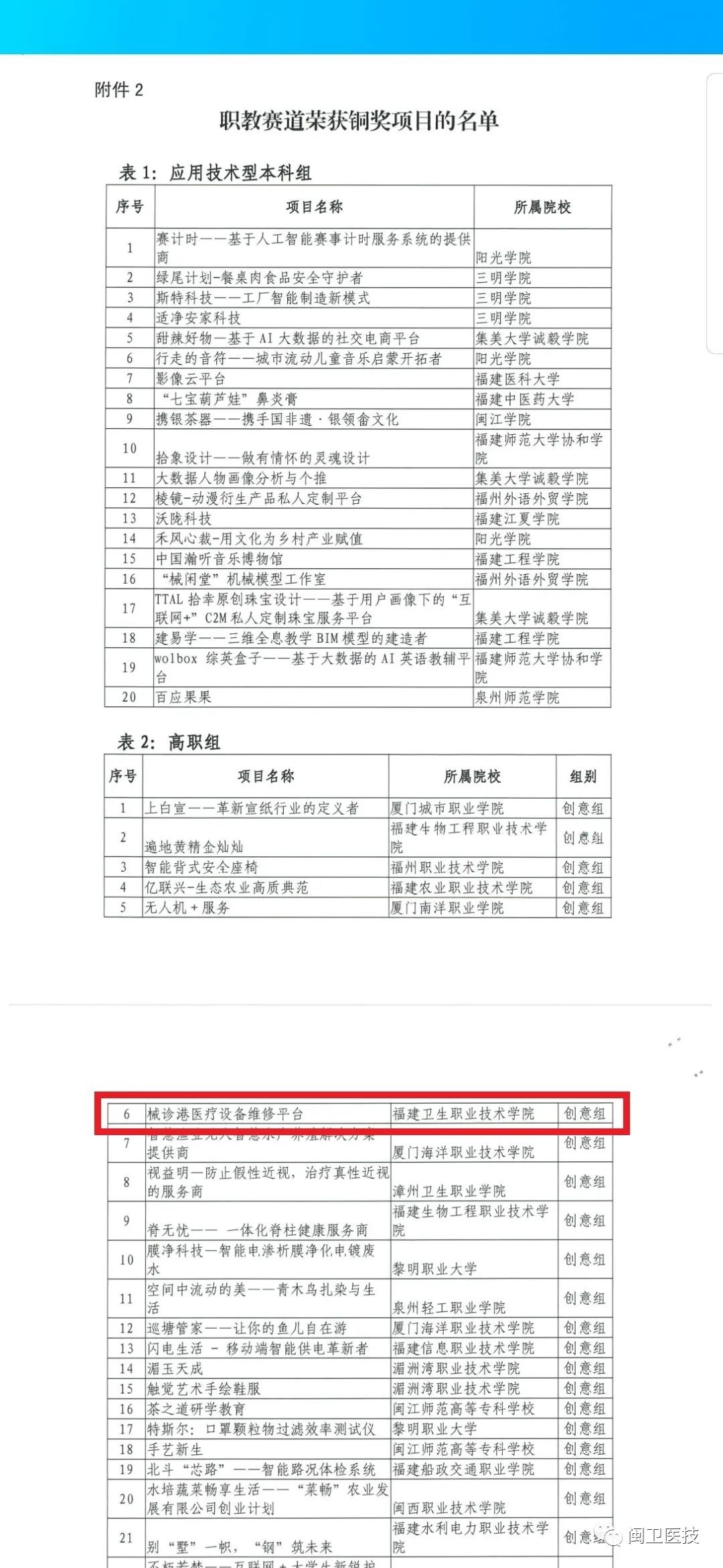 2020年8月31日,第六屆福建省“互聯(lián)網(wǎng)+”大學(xué)生創(chuàng)新創(chuàng)業(yè)大賽職教賽道暨第四屆黃炎培海峽職業(yè)教育創(chuàng)新創(chuàng)業(yè)大賽省級(jí)初賽網(wǎng)評(píng)結(jié)果公布,我院《械診港醫(yī)療設(shè)備維修平臺(tái)》項(xiàng)目榮獲省級(jí)銅獎(jiǎng)。該項(xiàng)目由醫(yī)學(xué)技術(shù)系18影像303班林詩(shī)婷、19檢驗(yàn)301班邱倩玉、17設(shè)備301班盧敏、17設(shè)備301班鐘林玉、19設(shè)備301班劉紫嫻、18影像303班朱麗敏、17投資學(xué)謝同心(師大協(xié)和學(xué)院)等七位同學(xué)共同,醫(yī)學(xué)技術(shù)系鐘偉雄老師主要指導(dǎo)。