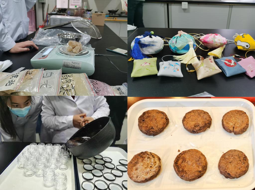 除了古法紫云膏、清潤棒棒糖外,19中藥學(xué)301班的多位同學(xué)還在教師黨員的指導(dǎo)下組織大家制作了各種特色中藥產(chǎn)品:王小佳、廖敏歡領(lǐng)隊(duì)制作了十全大補(bǔ)膏;陳劍輝、林少文領(lǐng)隊(duì)制作了精致藥香包;蔡裕華、潘焯彬領(lǐng)隊(duì)制作了生津雙根飲、紅豆餅、山藥糕,連續(xù)幾天,藥學(xué)院學(xué)子們徜徉在中藥文化的海洋中,對中華優(yōu)秀的本草文化自信滿滿。