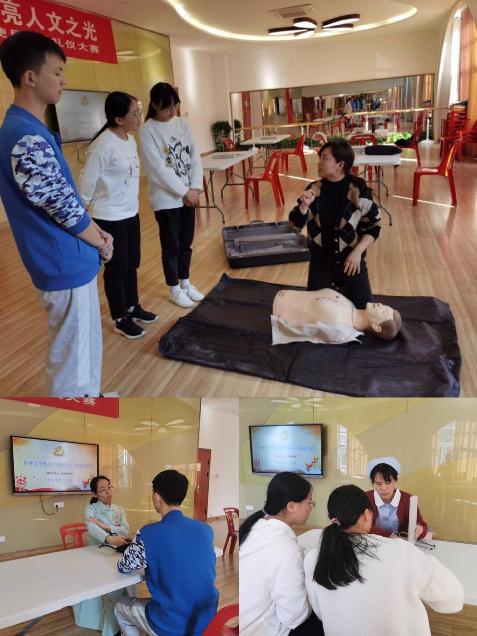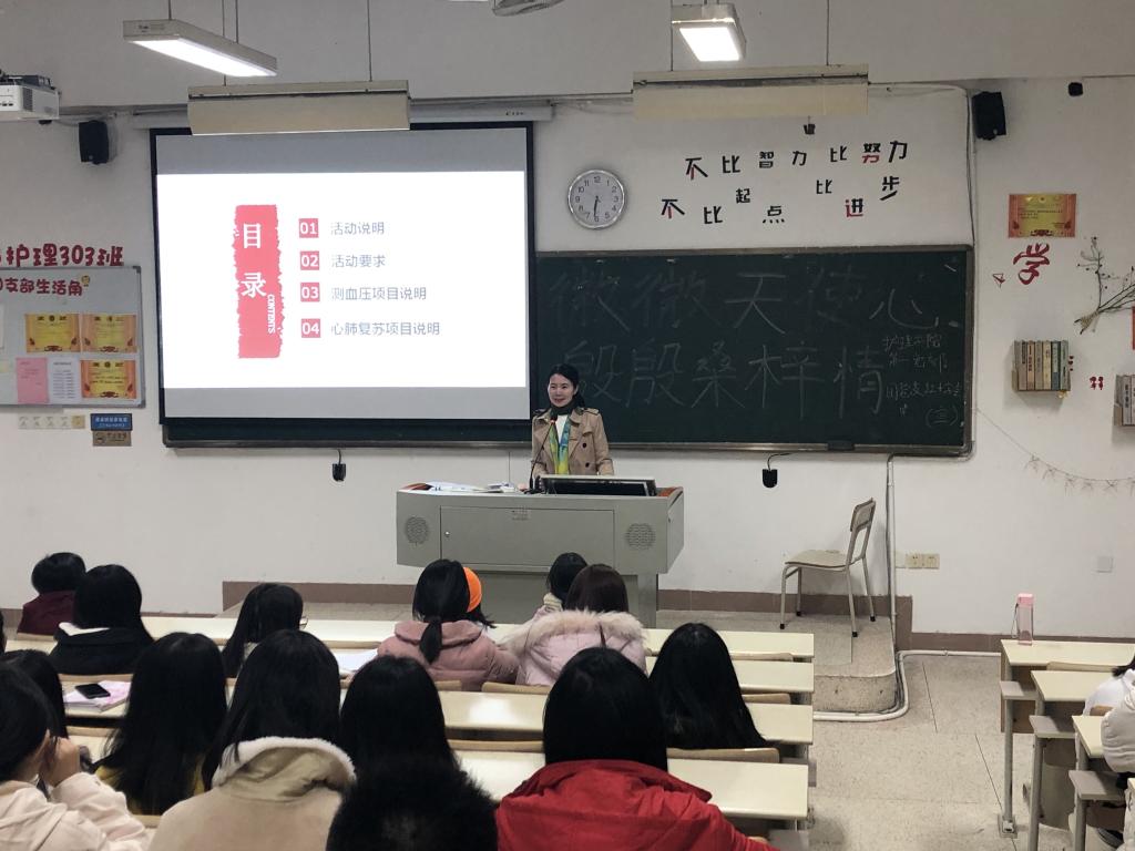 志愿服務(wù)活動(dòng)前培訓(xùn):護(hù)理實(shí)訓(xùn)室中,老師們正在細(xì)致的培訓(xùn)輔導(dǎo)。測血壓前后的各種注意要點(diǎn),心肺復(fù)蘇時(shí)的重點(diǎn)步驟,人文關(guān)懷要如何進(jìn)行……
