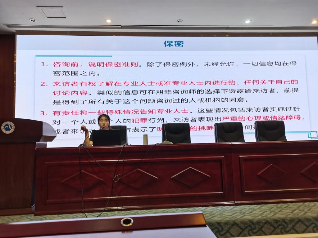 夏雪梅講解了什么是心理危機、如何識別心理危機信號、發(fā)現(xiàn)心理危機時應(yīng)如何上報。同時,她還從朋輩心理輔導(dǎo)的倫理概念、倫理原則、倫理準則和八大戒律四個方面給大家介紹了朋輩心理輔導(dǎo)的倫理規(guī)范和實操規(guī)范。