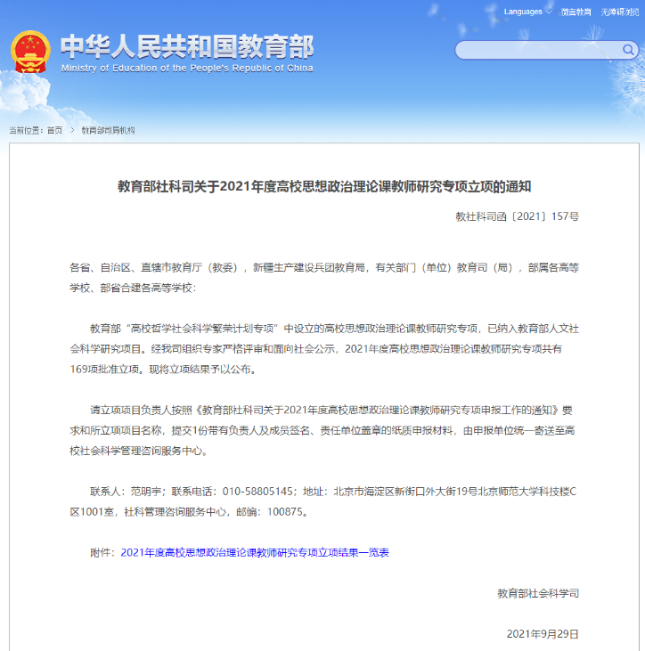 近日,2021年度教育部高校思想政治理論課教師研究專項(xiàng)立項(xiàng)結(jié)果公布,經(jīng)教育部社科司組織專家嚴(yán)格評(píng)審和面向社會(huì)公示,我校馬克思主義學(xué)院楊盈老師主持的課題“新時(shí)代勞動(dòng)教育融入高職院校思政課實(shí)踐教學(xué)路徑研究”獲批立項(xiàng)。