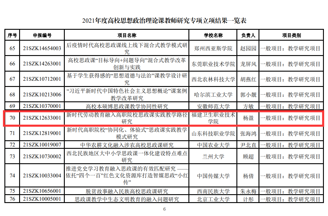 教育部高校思想政治理論課教師研究專項(xiàng)是“高校哲學(xué)社會(huì)科學(xué)繁榮計(jì)劃專項(xiàng)”的重要內(nèi)容,納入教育部人文社會(huì)科學(xué)研究項(xiàng)目。2021年度高校思想政治理論課教師研究專項(xiàng)共立項(xiàng)169項(xiàng)課題,全國(guó)高職院校入選項(xiàng)目?jī)H37項(xiàng),我校為福建省高職院校唯一獲批立項(xiàng)單位。