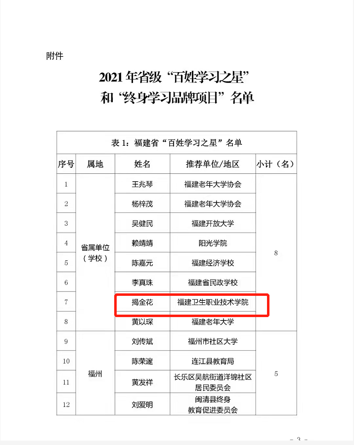 近日,根據(jù)文件《關(guān)于公布2021年省級(jí)“百姓學(xué)習(xí)之星” 和“終身學(xué)習(xí)品牌項(xiàng)目”名單的通知》閩終教服〔2021〕9號(hào),我校健康管理系揭金花老師認(rèn)定為2021年省級(jí)“百姓學(xué)習(xí)之星”;醫(yī)學(xué)基礎(chǔ)部項(xiàng)目“科普益民,健康相伴——百姓身邊的生命健康講堂”認(rèn)定為2021年省級(jí)“終身學(xué)習(xí)品牌項(xiàng)目”。特此祝賀!