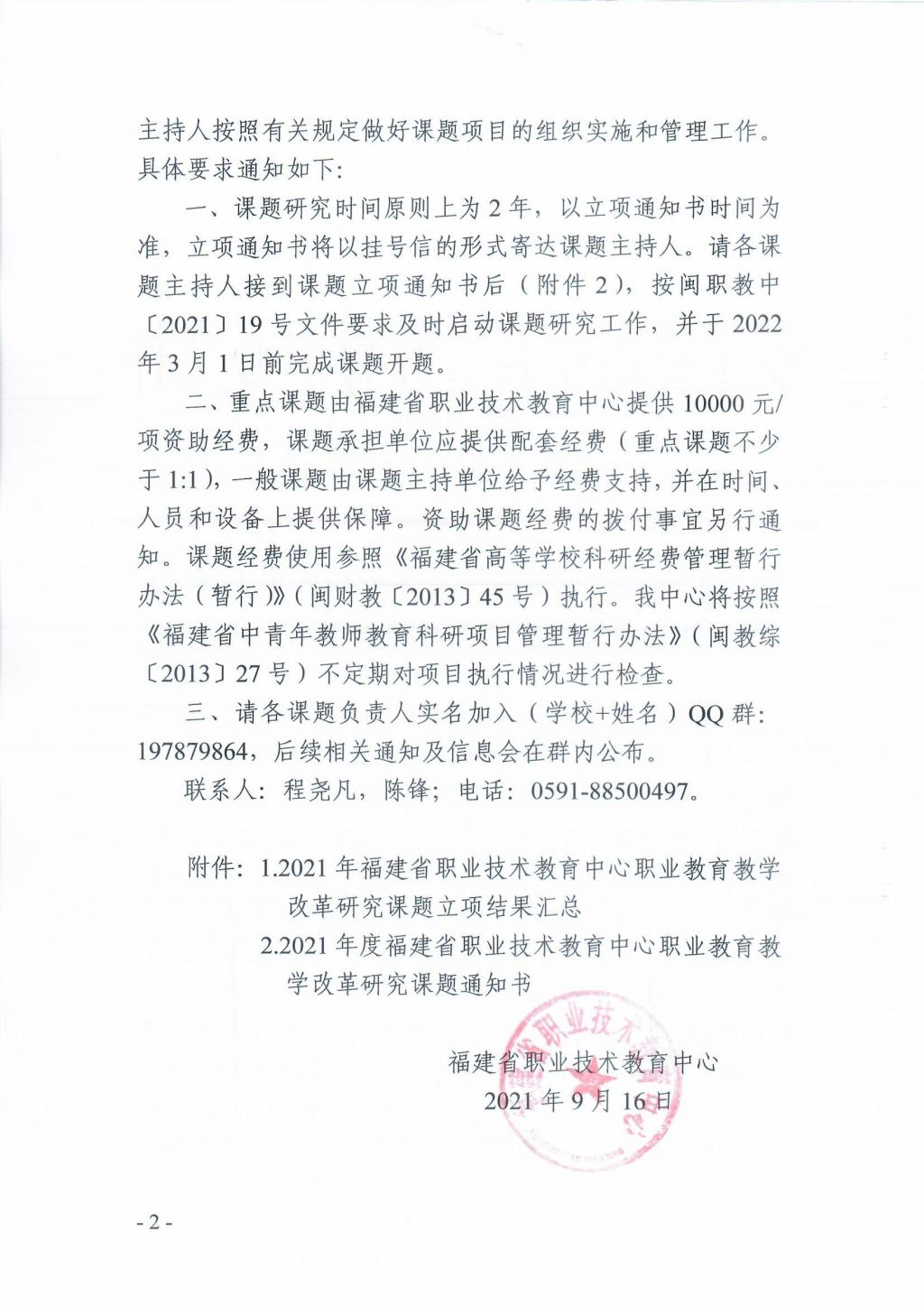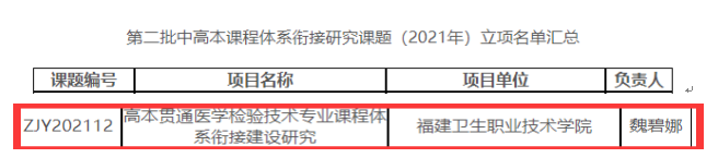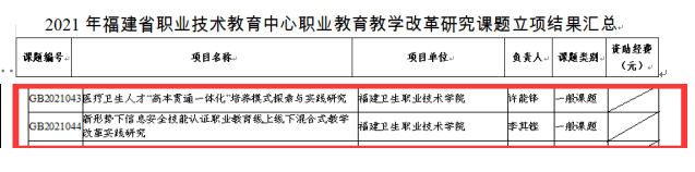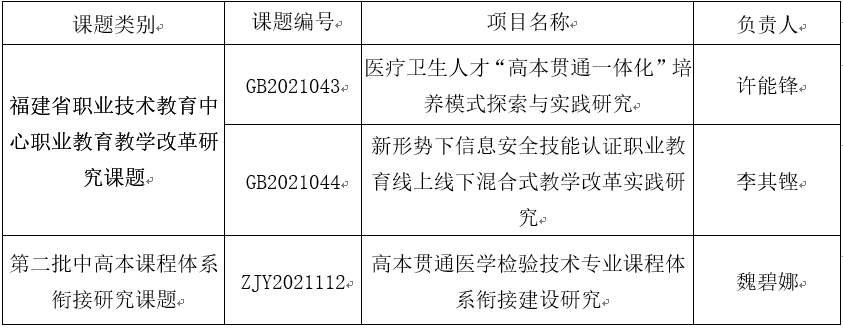 根據(jù)《關(guān)于公布2021年福建省職業(yè)技術(shù)教育中心職業(yè)教育教學(xué)改革研究課題立項結(jié)果的通知》(閩職教中[2021]48號)、《關(guān)于公布第二批中高本課程體系銜接研究課題(2021年)立項結(jié)果的通知》(閩職教中[2021]47號)文件,我校三項課題獲批立項。