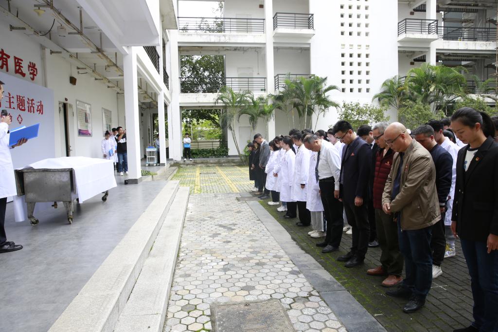 活動伊始,醫(yī)學系第四黨支部書記鄧元榮開講微黨課,主持人陳戴和老師飽含深情地進行生命教育主題宣講。師生集體行默哀禮,致敬無言良師。隨后,解剖學教研室袁婕教師帶領同學們進行解剖學誓詞宣誓。2020級四位學生代表現場朗誦詩歌《生命大愛》,表達心中的感動和對這些默默奉獻者的追思與感念。師生向大體老師鞠躬并敬獻鮮花,鄭重留言簽名表明心志。