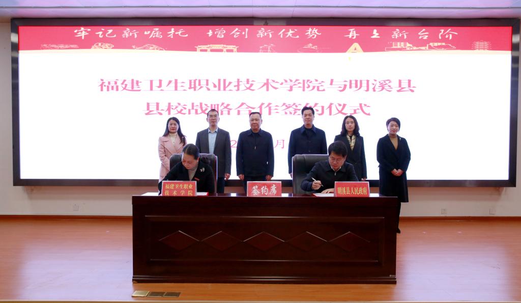 學期伊始,學校黨委書記曾武祈一行赴明溪縣簽署校縣合作戰(zhàn)略協議,并為大學生社會實踐基地及紅色教育基地揭牌。省衛(wèi)健委綜合監(jiān)督處處長陳繼清,三明市衛(wèi)健委黨組成員黃小平,明溪縣縣委書記鐘科、縣長陳華偉,學校副校長鄭翠紅等參加活動。