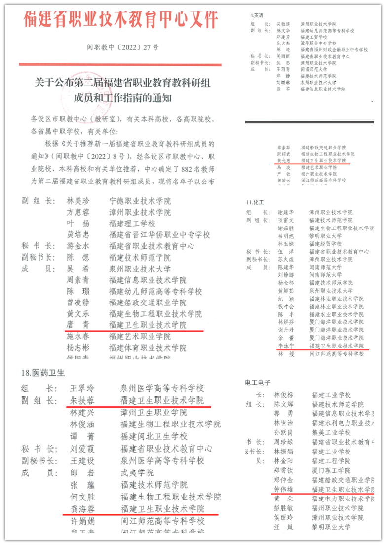 2022年5月11日,福建省職業(yè)技術(shù)教育中心公布第二屆福建省職業(yè)教育教科研組成員名單,我校朱扶蓉同志入選醫(yī)藥衛(wèi)生組副組長(zhǎng),龔海蓉、李泳寧、鐘偉雄、黃光惠、唐青五位同志分別入選醫(yī)藥衛(wèi)生組、化工組、電工電子組、英語(yǔ)組、信息技術(shù)組成員。