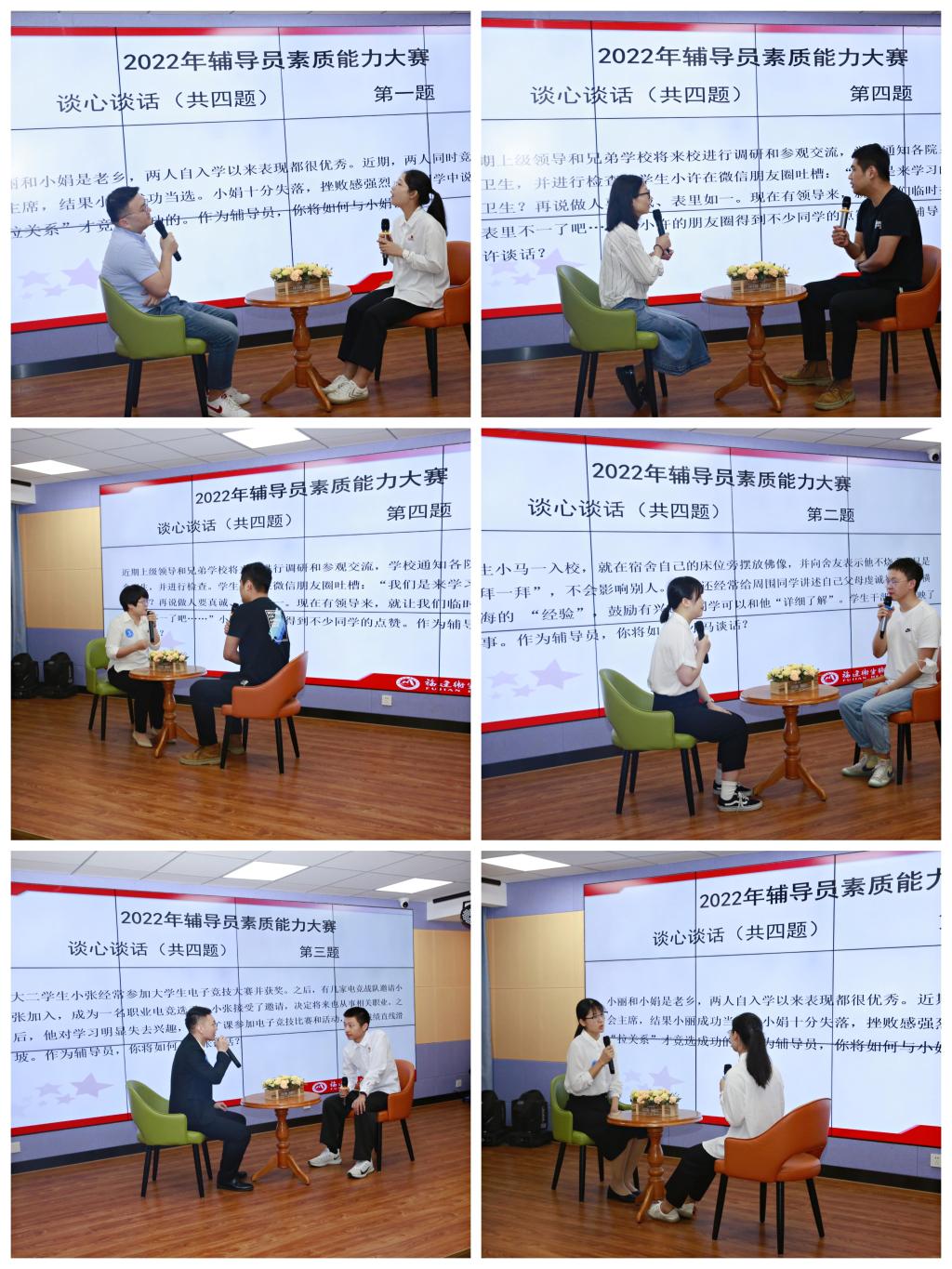 本次決賽參照全省輔導(dǎo)員素質(zhì)能力大賽最新賽制舉行,分為案例研討、談心談話兩個環(huán)節(jié)。