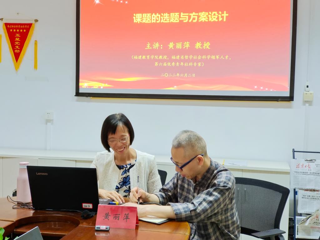 為全面提升我校思政課教師科研項(xiàng)目申報(bào)質(zhì)量,有效推進(jìn)課題研究工作,促進(jìn)教師專業(yè)化成長。2022年6月2日,我校馬克思主義學(xué)院邀請福建省哲學(xué)社會科學(xué)領(lǐng)軍人才、福建教育學(xué)院黃麗萍教授為全體專兼職思政課教師作《課題的選題與方案設(shè)計(jì)》專題講座。講座由馬克思主義學(xué)院副院長來朋珍主持。