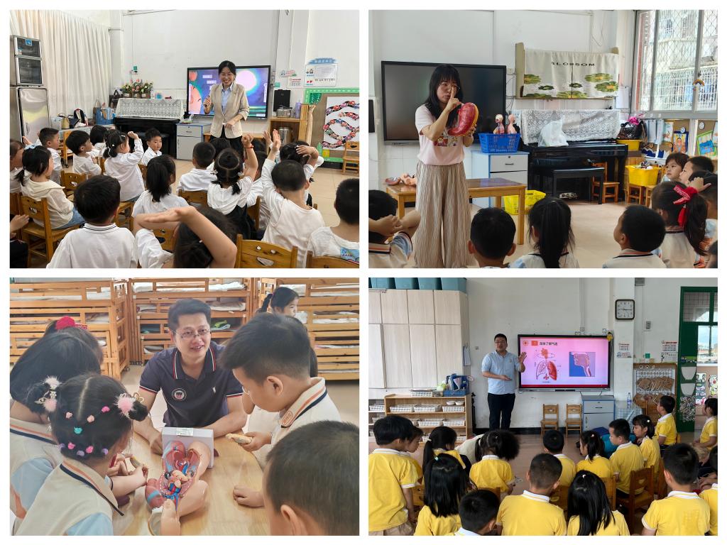活動(dòng)伊始,支部黨員教師在校健康科普青年講團(tuán)成員的協(xié)作下,從專業(yè)知識(shí)角度出發(fā),針對(duì)小班、中班、大班小朋友的年齡特點(diǎn)和理解程度,現(xiàn)場(chǎng)分班進(jìn)行繪本共讀、模型拼裝、模擬體驗(yàn)、急救知識(shí)宣教等內(nèi)容豐富的健康科普活動(dòng)。