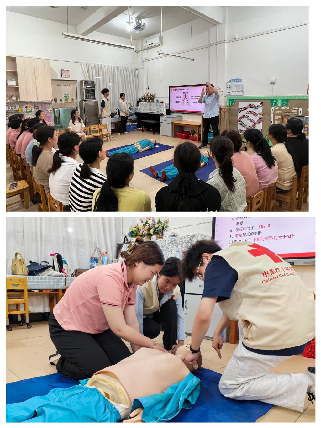 隨后,醫(yī)學(xué)院教師第二黨支部書(shū)記葉榕為中心幼兒園的教職工進(jìn)行急救培訓(xùn),內(nèi)容包含氣道異物梗阻的識(shí)別與現(xiàn)場(chǎng)救護(hù)及心肺復(fù)蘇,實(shí)用的專業(yè)知識(shí)讓大家收獲滿滿。