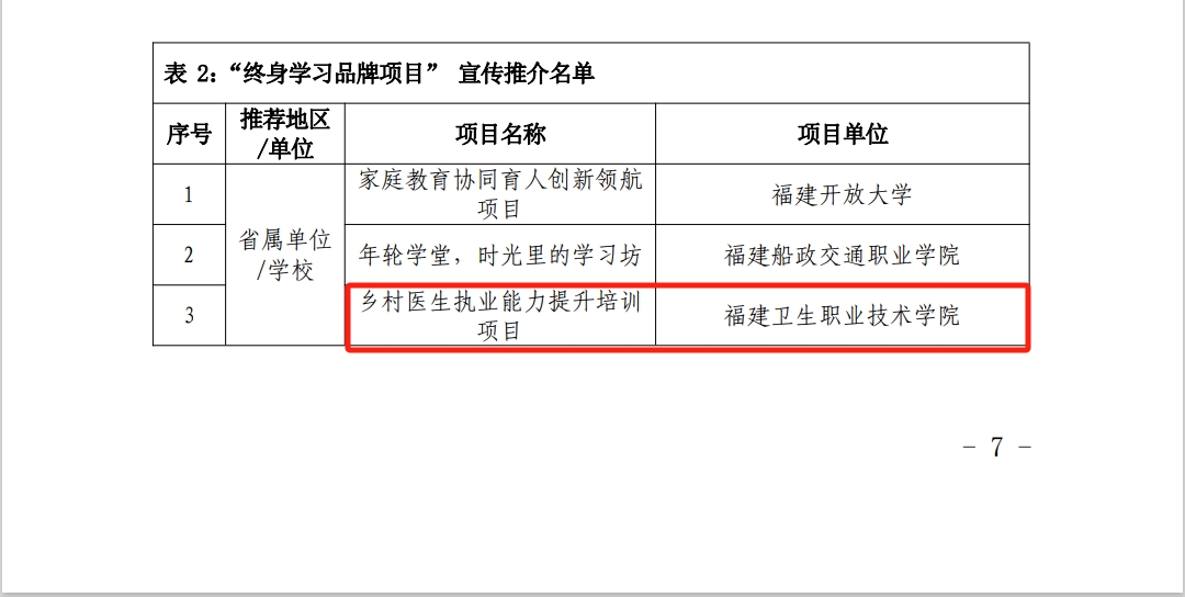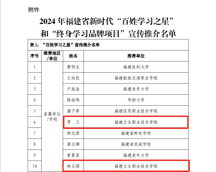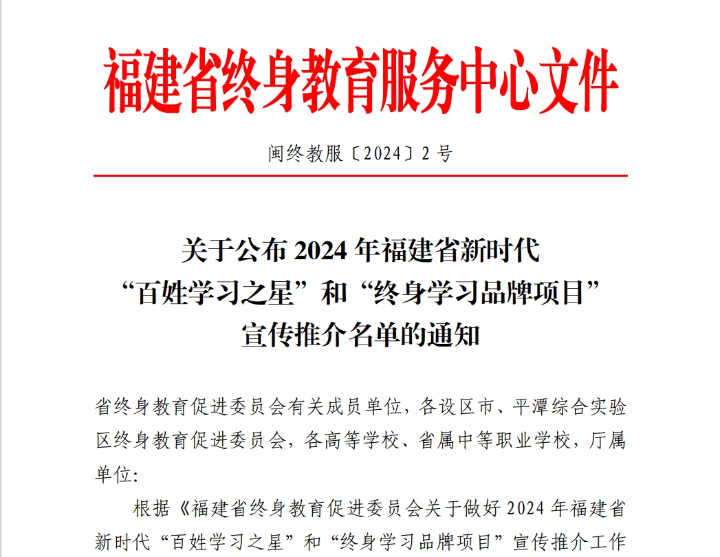 近日,福建省終身教育促進(jìn)委員會公布2024年福建省新時代“百姓學(xué)習(xí)之星”和“終身學(xué)習(xí)品牌項(xiàng)目”推介名單,我校醫(yī)學(xué)院林玉瓊老師、藥學(xué)院羅蘭老師入選2024年福建省新時代“百姓學(xué)習(xí)之星”;繼續(xù)教育學(xué)院申報(bào)項(xiàng)目《鄉(xiāng)村醫(yī)生執(zhí)業(yè)能力提升培訓(xùn)項(xiàng)目》入選2024年福建省新時代“終身學(xué)習(xí)品牌項(xiàng)目”。