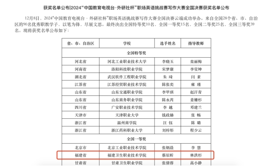 近日,2024“中國教育電視臺·外研社杯”職場英語挑戰(zhàn)賽寫作大賽國賽正式落幕,我校醫(yī)學(xué)院蔡辰昕同學(xué)從全國28個省、市、自治區(qū)的眾多優(yōu)秀選手中脫穎而出,榮獲英語寫作大賽全國決賽一等獎。