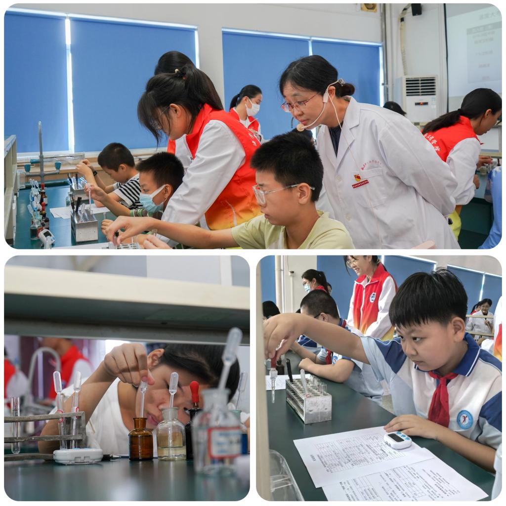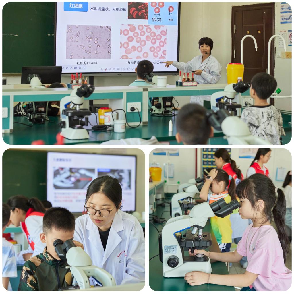 在專業(yè)老師和大學(xué)生志愿者的引導(dǎo)下,中小學(xué)生分組體驗(yàn)了6個科普項(xiàng)目,進(jìn)行檢驗(yàn)、影像、眼視光、醫(yī)療裝備、醫(yī)用電子等專業(yè)和職業(yè)初體驗(yàn)。在“微觀世界探險家”中,同學(xué)們通過顯微鏡觀察皮膚和口腔菌群;在“血液‘三俠客’”中認(rèn)識紅細(xì)胞、白細(xì)胞與血小板的超能力;在“奇妙唾液實(shí)驗(yàn)室”中動手驗(yàn)證酶的“甜蜜”作用;在“影像工坊”中感受磁共振、CT等大設(shè)備的大用處;在變身“電子小工匠”中制作會發(fā)光的電路板,體驗(yàn)醫(yī)療設(shè)備組裝;在“小小視光師”中進(jìn)行視力檢測,學(xué)習(xí)如何呵護(hù)眼健康。