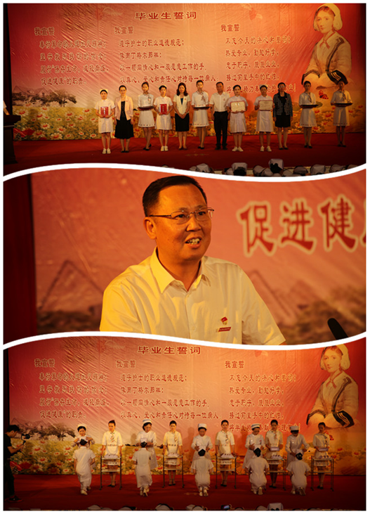 授帽傳光儀式結(jié)束后,全體畢業(yè)生在護理系吳婷婷老師的帶領(lǐng)下齊聲宣讀畢業(yè)誓言。莊嚴(yán)的宣誓,鏗鏘有力的聲音久久縈繞在會場上空,昭示著他們正式加入白衣天使的行列。其后,學(xué)生代表丁冠初和楊情情同學(xué)情緒激昂,感情真切,對學(xué)校與老師的關(guān)心和栽培表達(dá)了深摯的感激之情;教師代表吳美丹老師深情地回憶了同學(xué)們在成長中的點滴進步和許多平凡的感動,并向同學(xué)們提出了殷切的期望。今年,護理系還特別邀請了家長代表到場,兩位家長代表分別發(fā)言,表達(dá)了對學(xué)校和老師的感激之情,也提出了對孩子的期望。學(xué)生向家長獻上鮮花并熱烈擁抱,現(xiàn)場場面溫馨感人,傳遞著感動、感恩的暖意,令所有人動容,將畢業(yè)典禮推向高潮。